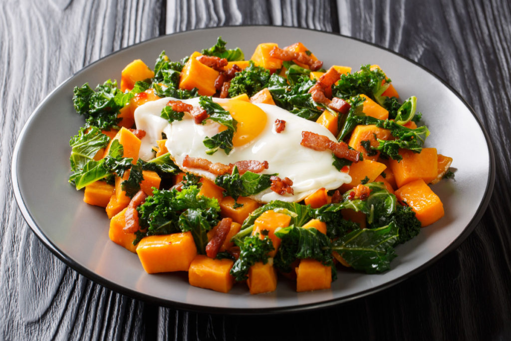 Ingredients 4 slices bacon 1 ½ cups butternut squash, diced 2 cups Brussels sprouts, diced